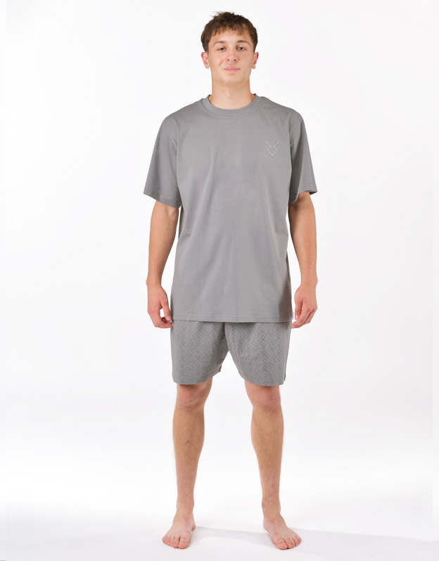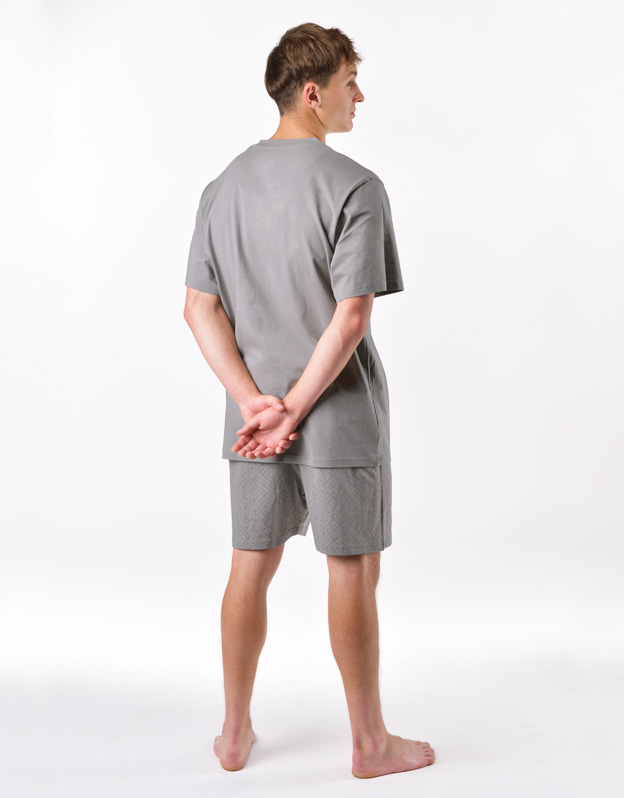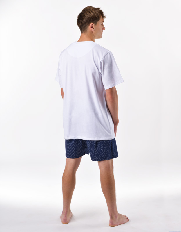 Luźna piżama męska wykonana z wysokiej jakości dzianiny zapewni Ci komfort podczas snu. Spodenki są zadrukowane drobnym wzorem, a koszulka z krótkim rękawem ozdobiona jest mniejszym nadrukiem na klatce piersiowej.