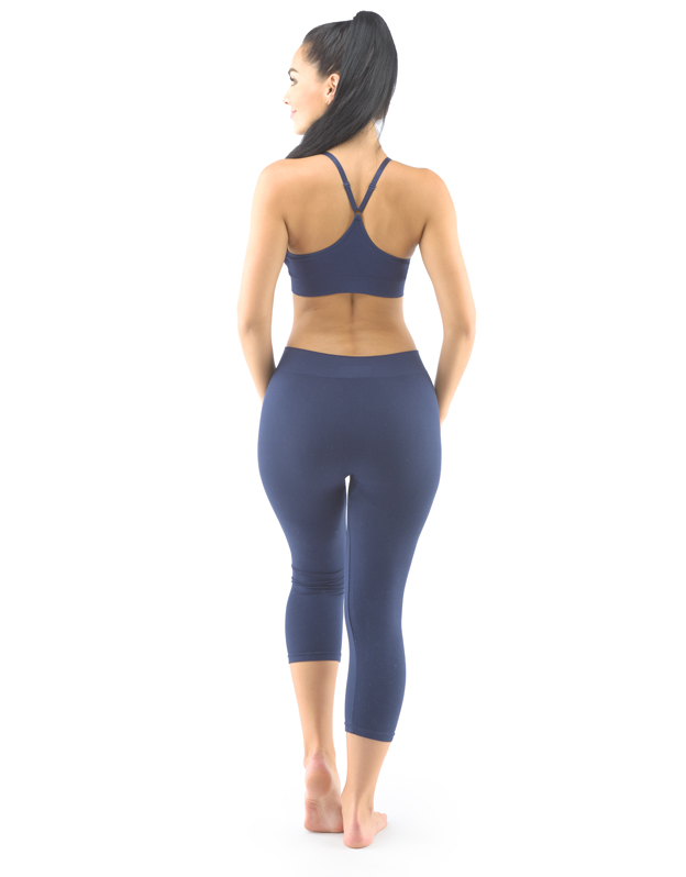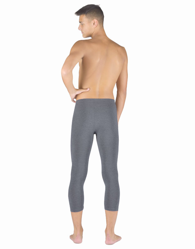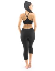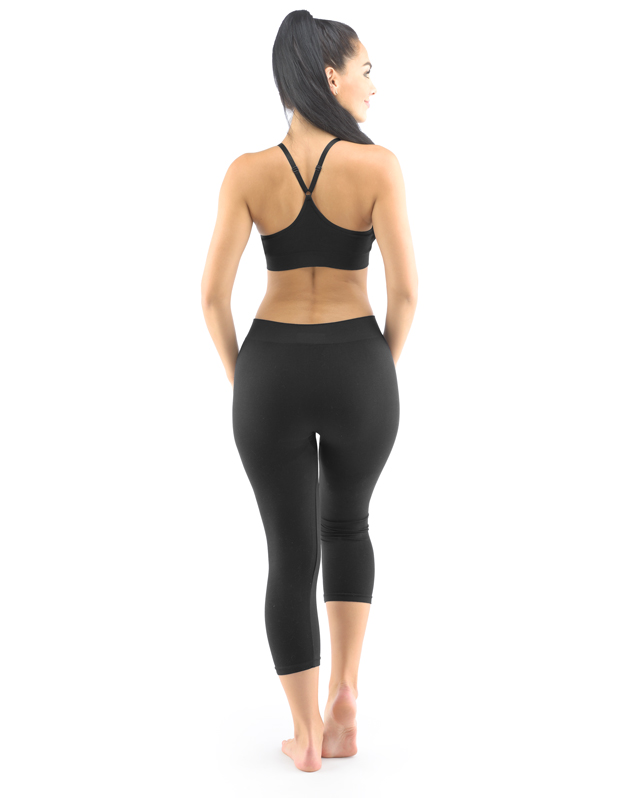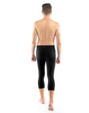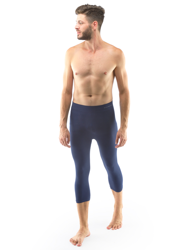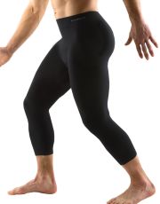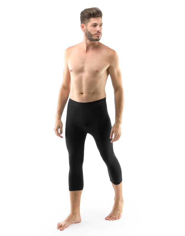 Legginsy o długości 3/4, bezszwowa bielizna sportowa damska i męska. Legginsy są jednokolorowe. W zakładce dzianinowe logo w kolorze szarym. Te legginsy są bardzo uniwersalne ze względu na swój krój, użyty materiał oraz czarny kolor. Można je nosić zarówno podczas uprawiania sportu, jak i latem z dłuższymi T-shirtami jako nowoczesna alternatywa dla legginsów.