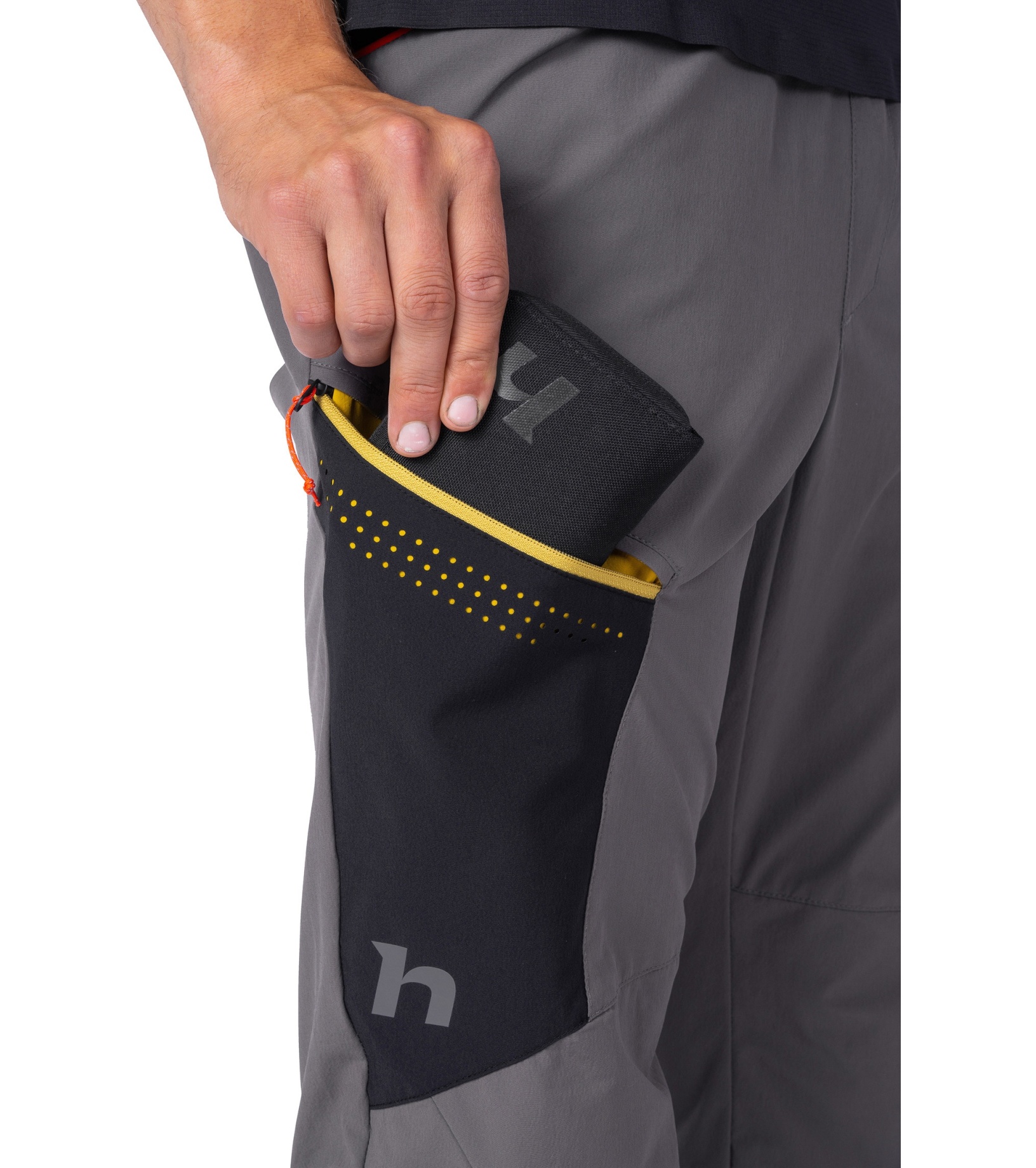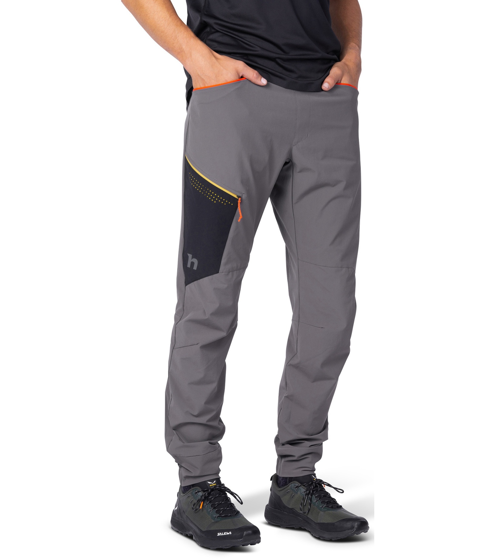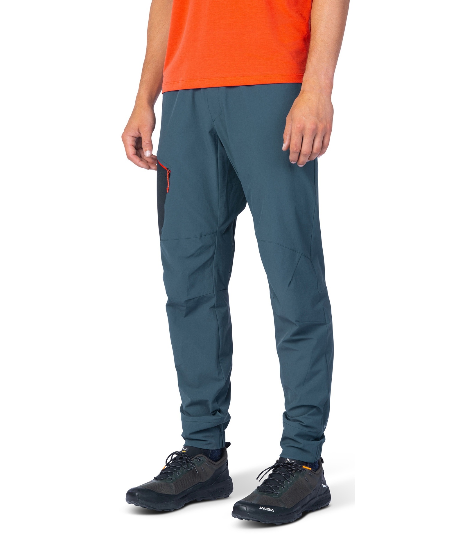 Dolna część nogawek jest lekko zwężana i elastyczna z tyłu dla lepszego dopasowania. Dwie przestronne kieszenie z przodu i jedna kieszeń na udzie z wysokiej jakości zamkiem błyskawicznym YKK umożliwiają praktyczne przechowywanie drobnych przedmiotów. Drukowane kieszenie wewnętrzne nadają modelowi nowoczesny wygląd. Powierzchnia spodni została pokryta impregnatem DWR-C0, który nie zawiera szkodliwych substancji fluorowęglowodorowych, dzięki czemu jest bardziej przyjazny dla środowiska (wolny od PFC).