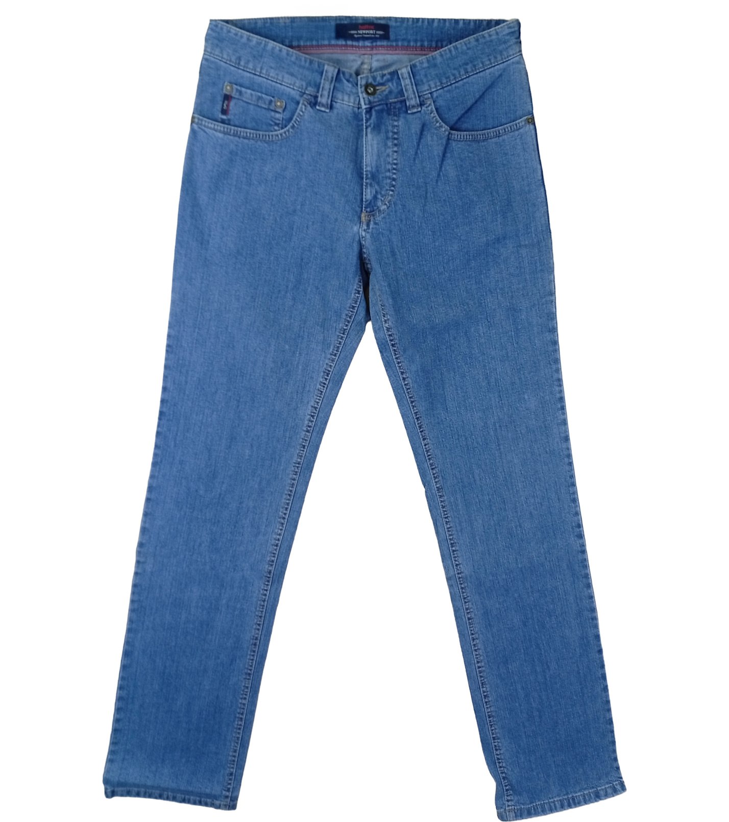 Klasyczne męskie jeansy Hattric w jasnoniebieskim kolorze denim. Tradycyjny krój z pięcioma kieszeniami, zapinanymi na guzik i zamek błyskawiczny, uzupełniony szlufkami na pasek, zapewnia ponadczasowy wygląd i praktyczność. Dzięki przyjemnej mieszance bawełny z elastanem spodnie idealnie dopasowują się do sylwetki, są wygodne i jednocześnie zachowują swój kształt.