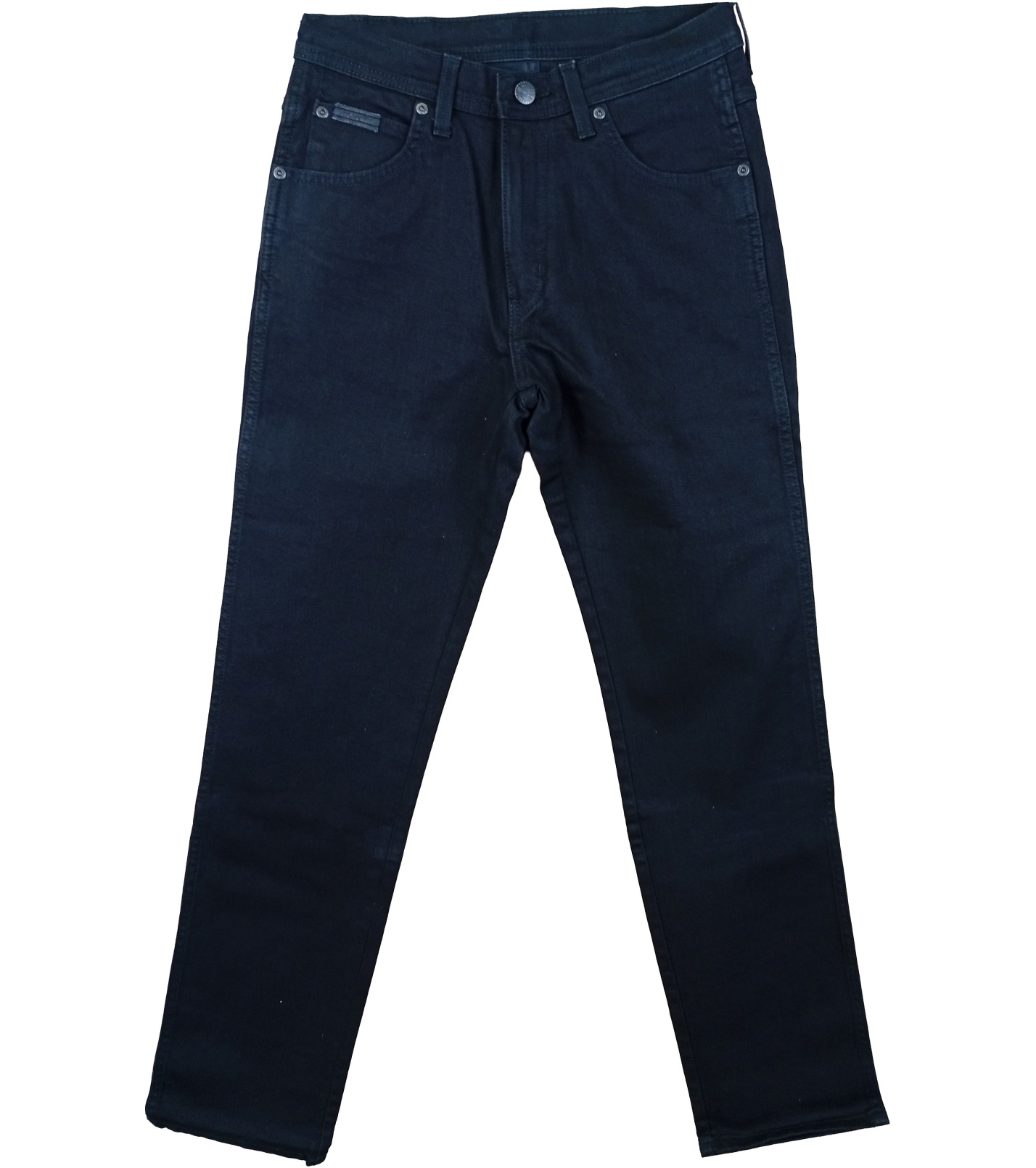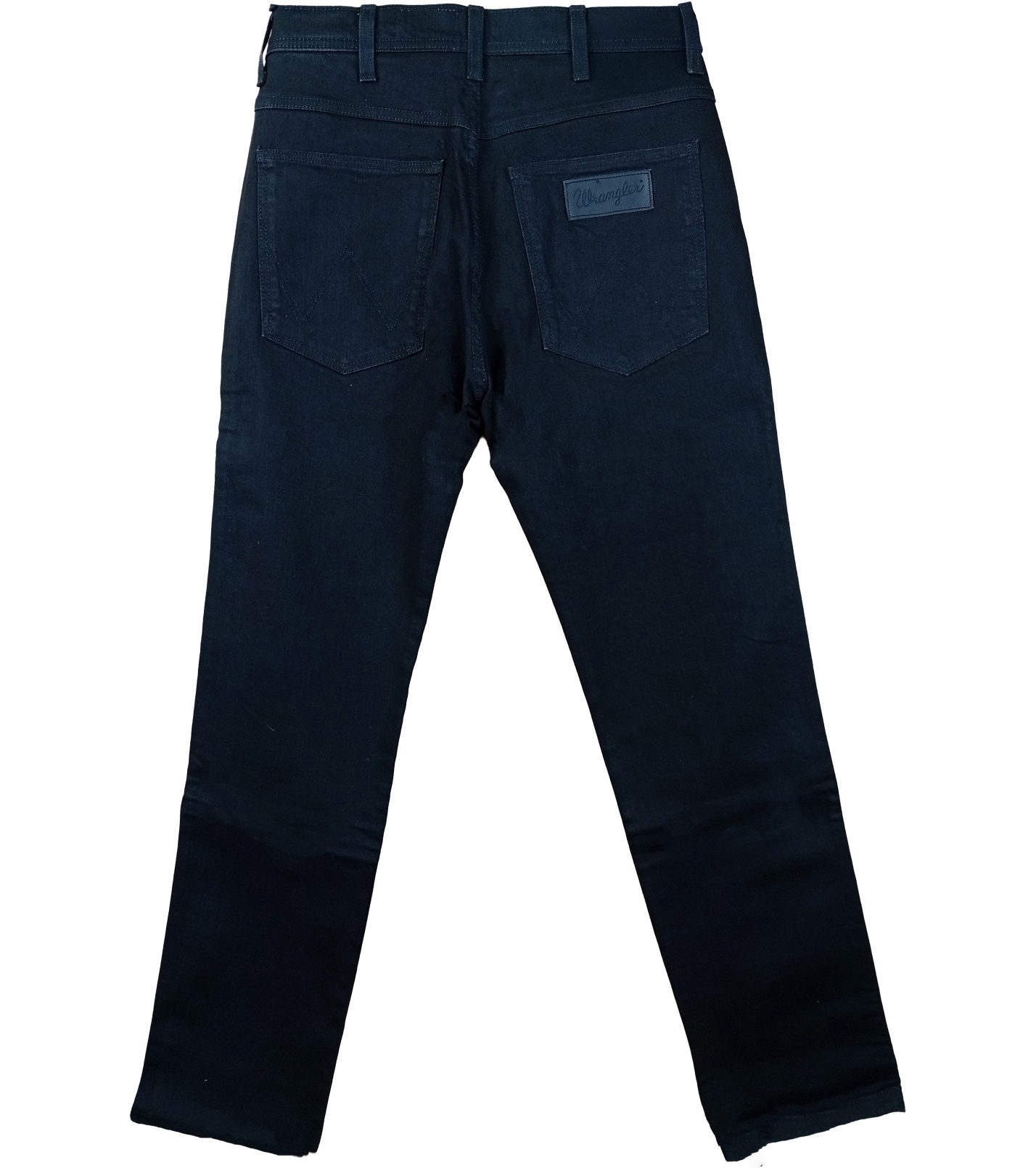 Czarne jeansy męskie Wrangler o prostym kroju i średnim stanie. Mają pięć kieszeni, zapięcie na suwak i guzik oraz tylne kieszenie z charakterystycznym przeszyciem w kształcie litery „W” i skórzaną metką Wrangler.
