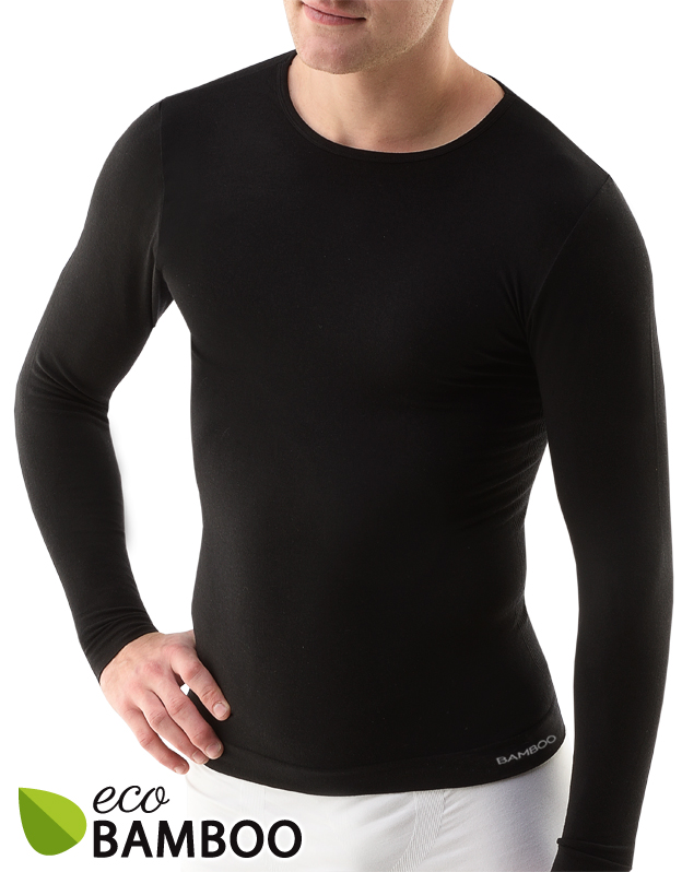 T-shirt z długim rękawem, bezszwowa bielizna męska. Dolna krawędź jest wykończona bezszwowo. Dekolt wykończony lamówką. T-shirt jest jednokolorowy. Nie ma logo.