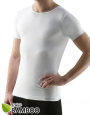 T-shirt z krótkim rękawem, bezszwowa bielizna męska. Dolna krawędź jest wykończona bezszwowo. Dekolt wykończony lamówką. T-shirt jest jednokolorowy. Nie ma logo.