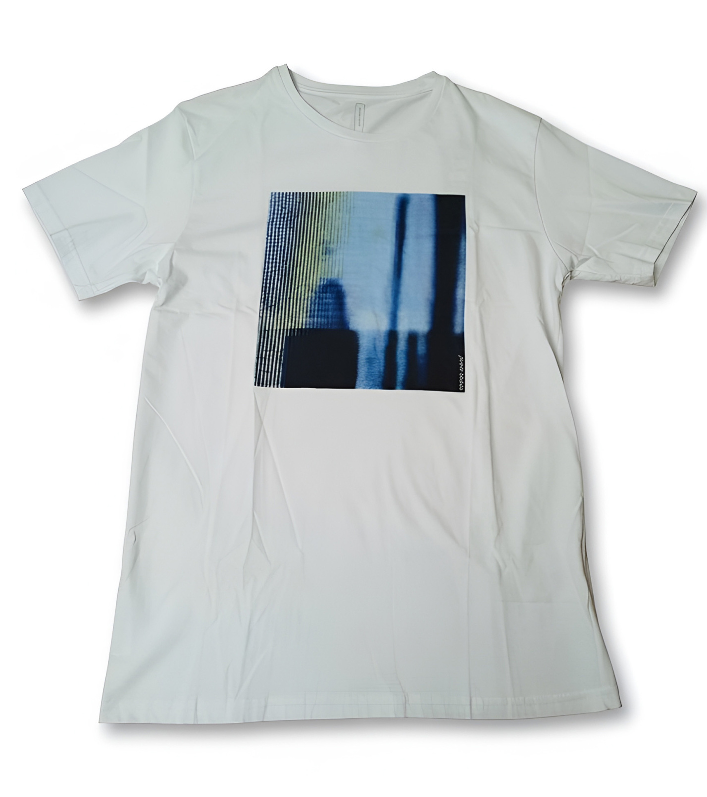 Stylowy męski bawełniany T-shirt w kolorze białym z nowoczesnym, abstrakcyjnym nadrukiem w odcieniach błękitu z przodu. Wykonany z wysokiej jakości, przyjemnej bawełny, która gwarantuje wygodę przez cały dzień. Dzięki prostemu krojowi, łatwo go zestawić z jeansami i szortami, idealnie nadaje się do noszenia na co dzień.