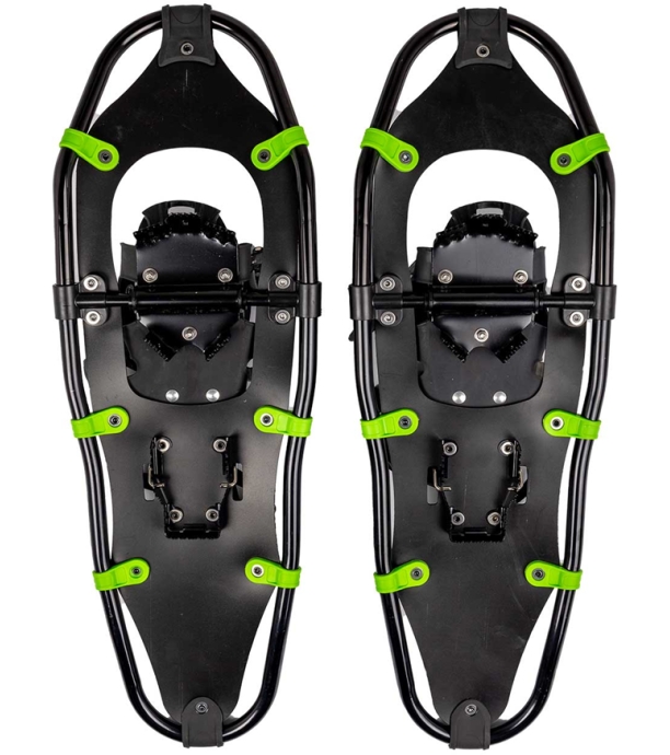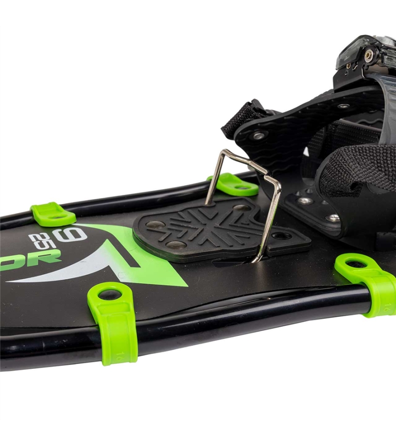 Rakiety śnieżne z aluminiową ramą, w komplecie ze składaną podpórką pod piętą, która ułatwia wejście pod górę. Wiązania do wszystkich typów butów w rozmiarach od 35 do 49. Kolce ułatwiają poruszanie się po zmarzniętym śniegu. W zestawie z praktyczną torbą.