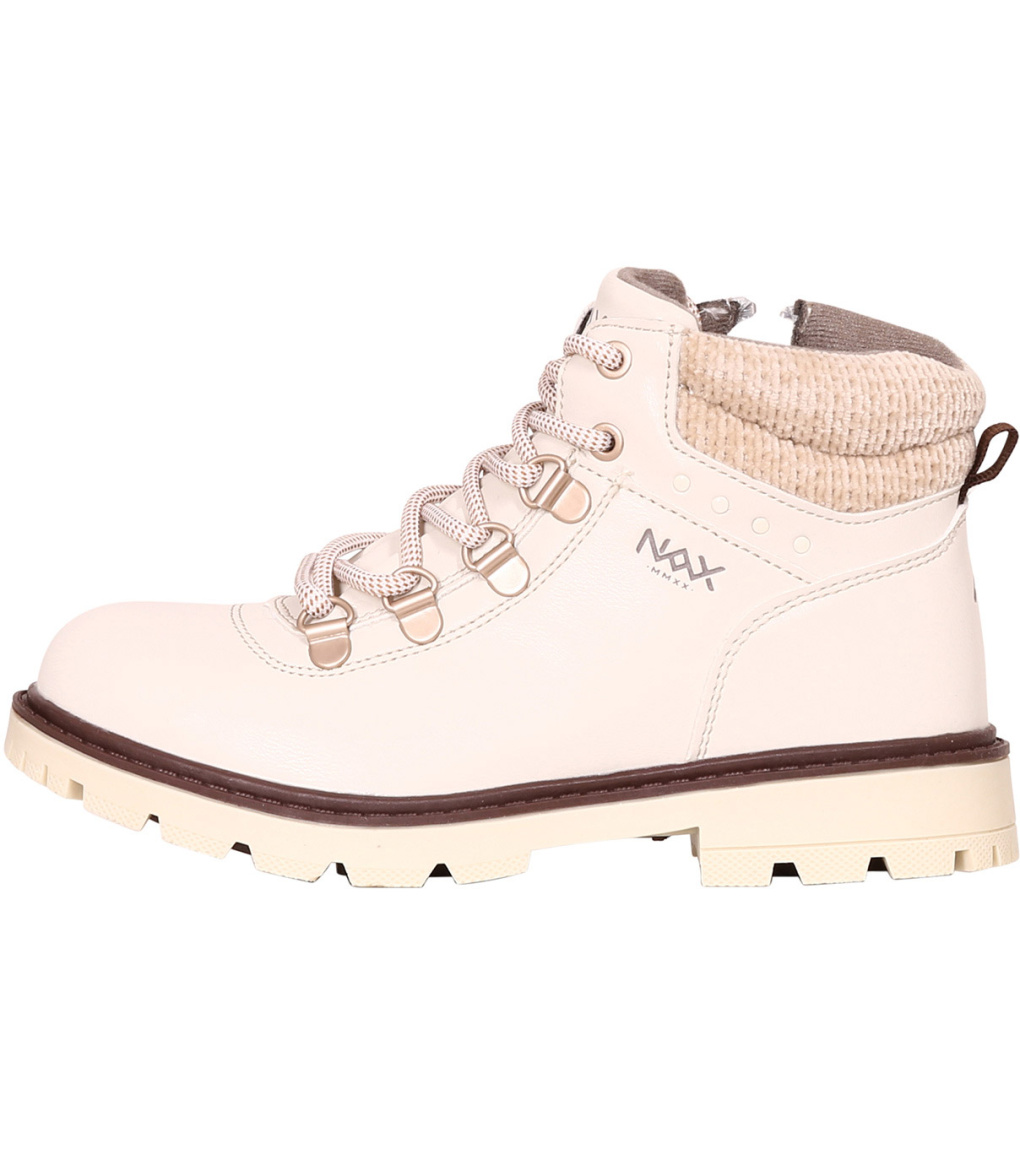Dziecięce wysokie buty FALBO od marki NAX. Wykonane w nowoczesnym stylu z podwójnym zapięciem, klasycznymi sznurowadłami i bocznym zamkiem. Z tyłu znajduje się pętelka ułatwiająca zakładanie butów. Materiał wierzchni wykonany jest z wodoodpornego materiału. Podeszwa jest odporna na uszkodzenia mechaniczne, a dzięki strukturalnemu wzorowi nic Cię nie zaskoczy na śniegu.
