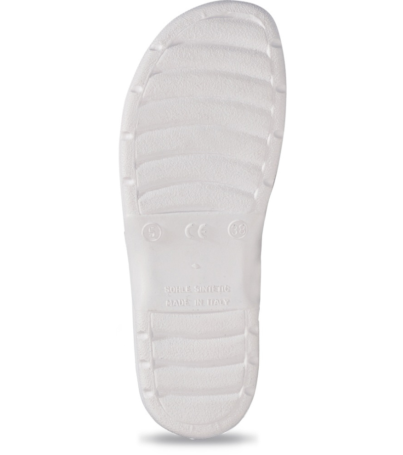 Opis: Damskie i męskie klapki z pakiem regulującym na pięcie wykonanym z powlekanej skóry.