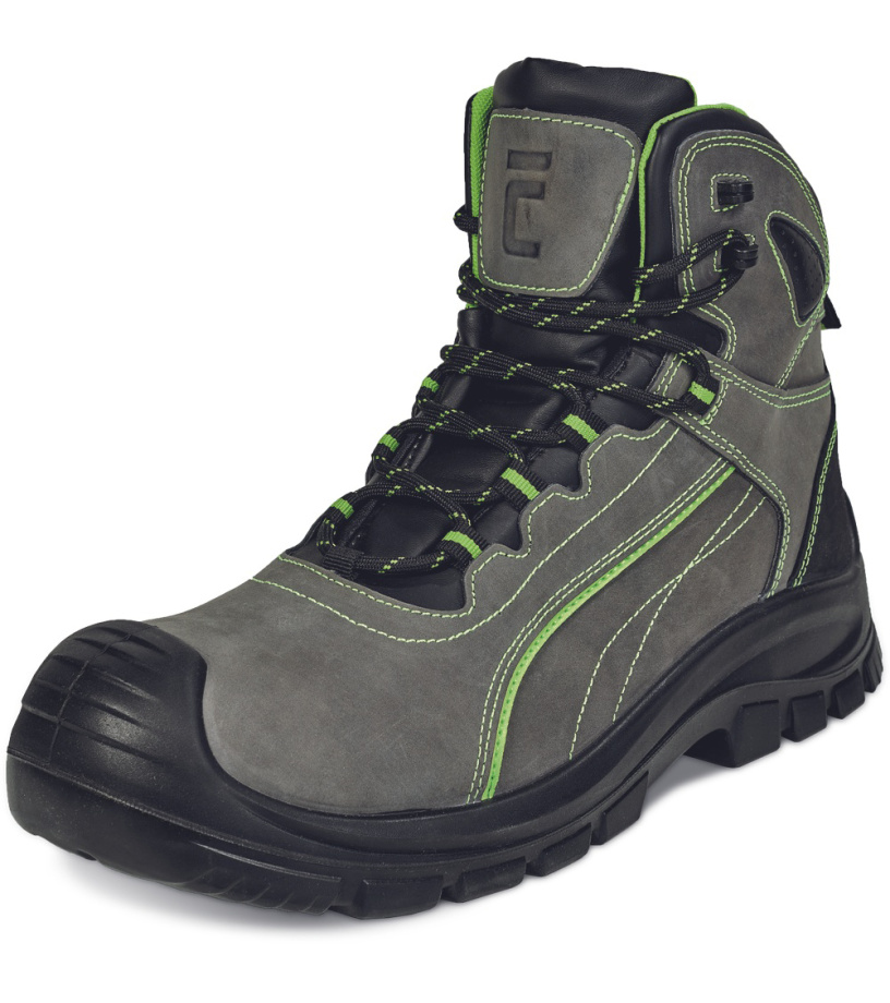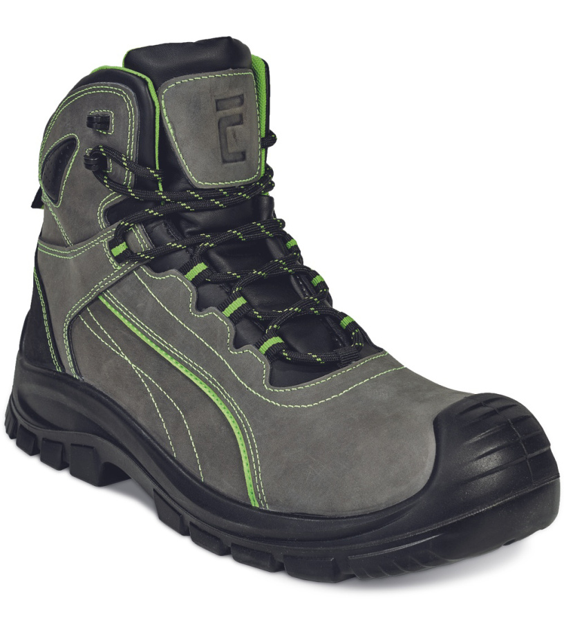 Opis: Trzewiki ochronne z kompozytowym podnoskiem i aramidową wkładką antyprzebiciową. Podeszwa wykonana z podwójnej gęstości PU. Masywne oblanie podnoska. Cholewka wykonana z wodoodpornej skóry nubukowej.