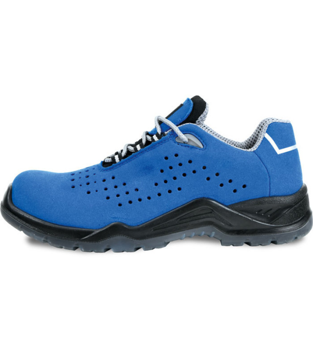 Opis: Safety low shoe in a modern blue-black color combination. The upper of the shoe is made of microfiber and perforated along the entire length. The oil-resistant non-slip outsole is made of polyurethane and transparent thermopolyurethane. The outsole ensures not only comfort but also maximum safety at every step. The shoes are equipped with a comfortable, perforated inner insole, which guarantees comfort and air circulation inside the shoe. The absorption of energy in the heel area absorbs shocks and reduces the feeling of fatigue in the feet. Thanks to the safety composite toe cap, the footwear meets the requirements of the EN ISO 20345: 2011 standard. This means that the feet are protected against compression with a force of up to 15 kN or the fall of a load of up to 20 kg from a height of 1 m. The feet are also protected from below, thanks to the antipuncture composite midsole. The shoes do not contain metal components and are equipped with the ESD function. Therefore, it is an ideal model for indoor spaces and sensitive environments, where it is necessary to prevent sparks from electrostatic discharge or for rooms equipped with a safety frame. Thanks to the minimalist design, this model will go great with most Cerva workwear collections.