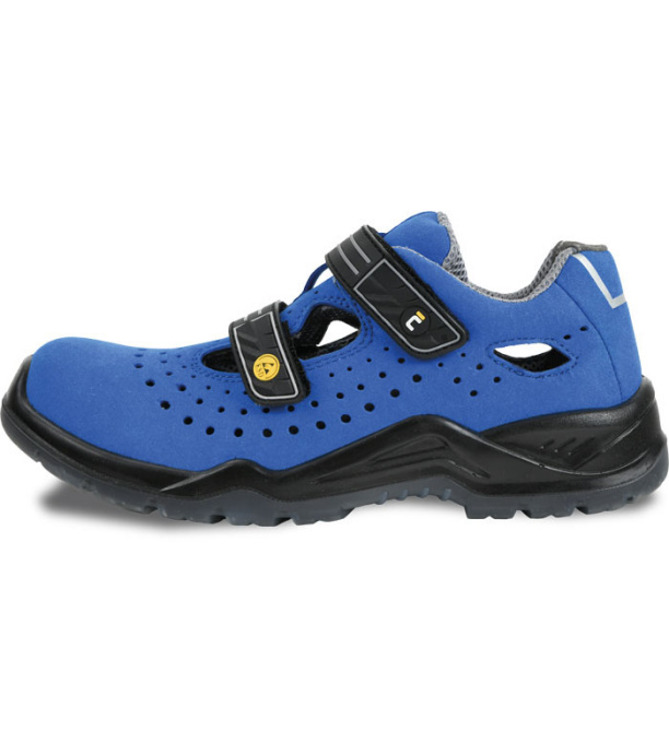 Sandały ochronne w nowoczesnym zestawieniu kolorystycznym niebiesko-czarnym. Cholewka buta wykonana jest z mikrofibry i perforowana na całej długości. Antypoślizgowa, olejoodporna podeszwa wykonana jest z poliuretanu oraz przezroczystego termopoliuretanu. Podeszwa zapewnia nie tylko wygodę, ale także maksymalne bezpieczeństwo na każdym kroku. But wyposażono w wygodną, perforowaną wkładkę, która gwarantuje wygodę i cyrkulację powietrza wewnątrz buta. Absorpcja energii w obszarze pięty amortyzuje uderzenia i zmniejsza zmęczenie nóg. Dzięki ochronnemu podnoskowi z kompozytu, obuwie spełnia wymagania normy EN ISO 20345:2011. Oznacza to, że stopy są zabezpieczone przed ściskaniem siłą do 15 kN lub obciążeniem o wadze do 20 kg spadającym z wysokości 1 m. Stopy są również chronione od spodu dzięki odpornej na przebicie kompozytowej wkładce. Obuwie nie zawiera elementów metalowych i jest wyposażone w funkcję ESD. Dlatego jest to idealny model do pomieszczeń wewnętrznych i wrażliwych środowisk, w których konieczne jest zapobieganie iskrzeniu z wyładowań elektrostatycznych lub do pomieszczeń wyposażonych w ramę bezpieczeństwa. Buty będą odpowiednie dla pracowników z wysokimi podbiciami, ponieważ dzięki bardzo wygodnemu zapięciu na rzep istnieje możliwość dopasowania górnej części butów do dokładnego rozmiaru i tym samym uzyskania maksymalnego komfortu podczas pracy.