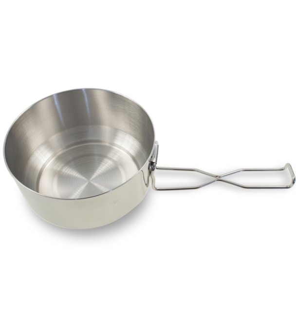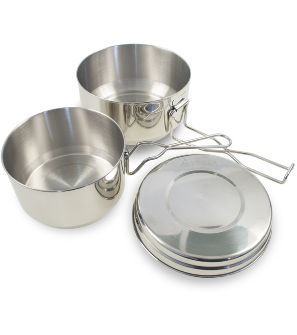 Komplet menażek ze stali nierdzewnej. Duża miska 1,25 l, mała miska 0,85 l, pokrywka 0,3 l. Stal nierdzewna jest bardziej odpowiednia do styku z żywnością niż aluminium.
