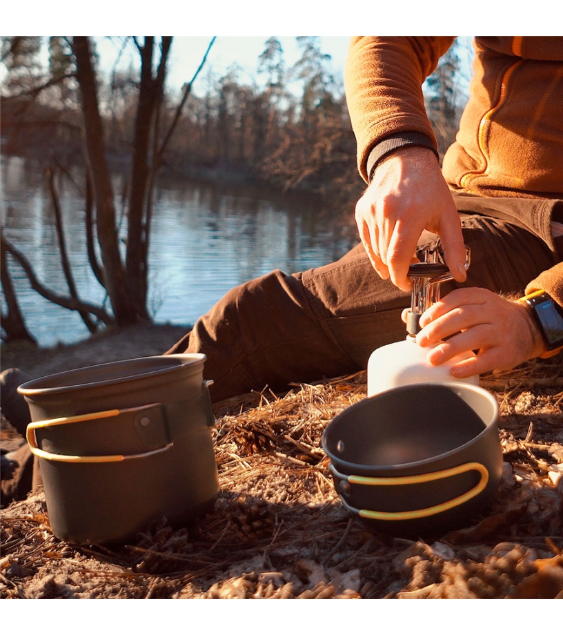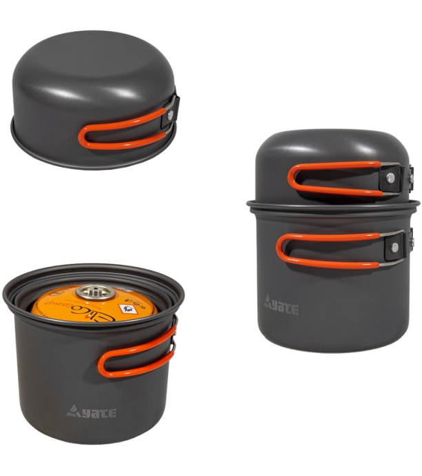 Zestaw naczyń dla 1 - 2 osób wykonany z anodowanego aluminium spożywczego odpornego na przetarcia. Uchwyty są zabezpieczone przed poparzeniem silikonem i wygodnie leżą w dłoni. Dostarczane z opakowaniem transportowym. Bardzo lekkie i kompaktowe. Kartusz gazowy (300 i 500g) oraz palnik wygodnie zmieszczą się w garnku.