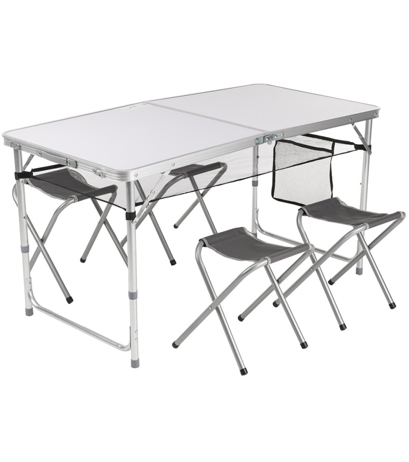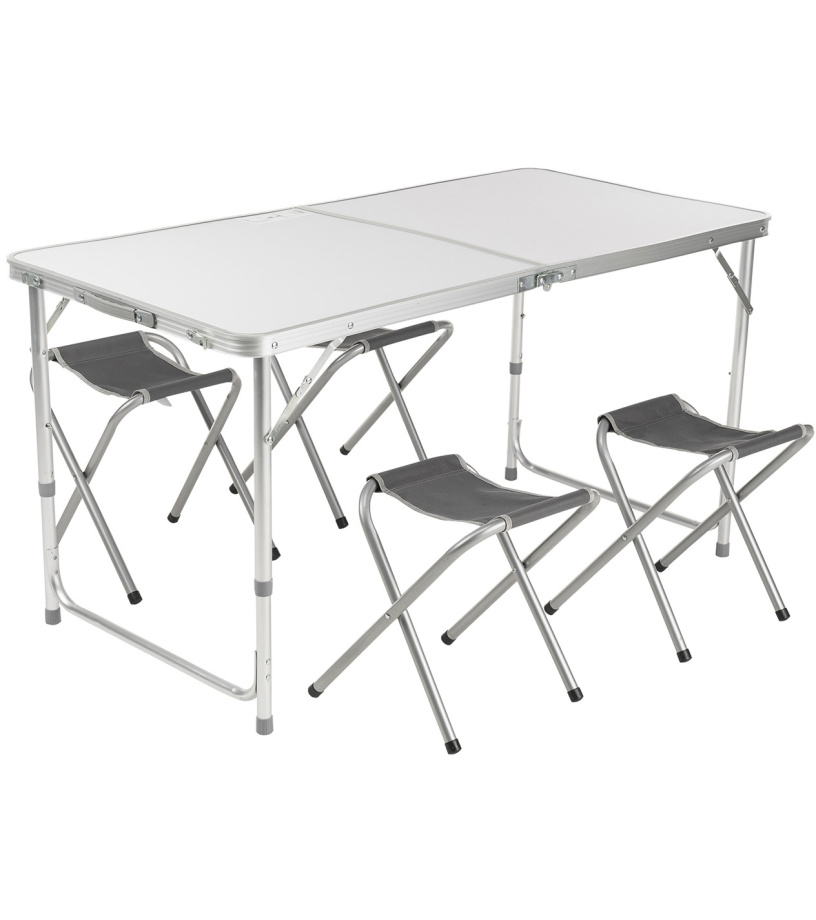 Lubisz biwaki i chcesz mieć swój komfort? Kup stół i 4 krzesła HAWAII. Stół ma konstrukcję aluminiową i wymiary 150 x 60 x 55 cm, krzesła wykonane są ze stali o wymiarach 30 x 32 x 37 cm.