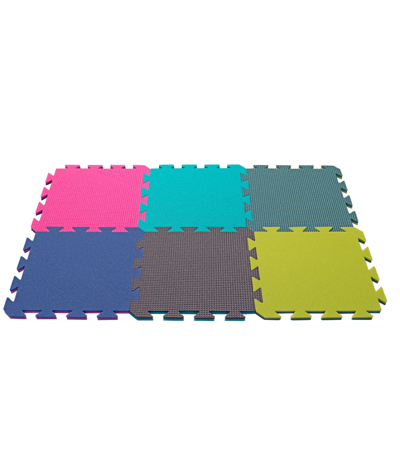 Kwadratowe płytki wykonane z miękkiej pianki polietylenowej. Dzięki zamkom można z nich złożyć matę do ćwiczeń, matę do zabawy dla dzieci lub ciepłą matę do łazienki. Łatwe w składaniu i rozkładaniu, minimalne wymagania dotyczące przechowywania i konserwacji, doskonałe właściwości termoizolacyjne, materiał antypoślizgowy i antypoślizgowy, a także amortyzacja na najwyższym poziomie. Płytka składa się z dwóch warstw, z których każda ma inny kolor. Możliwy jest montaż jedno- lub wielokolorowej powierzchni.
